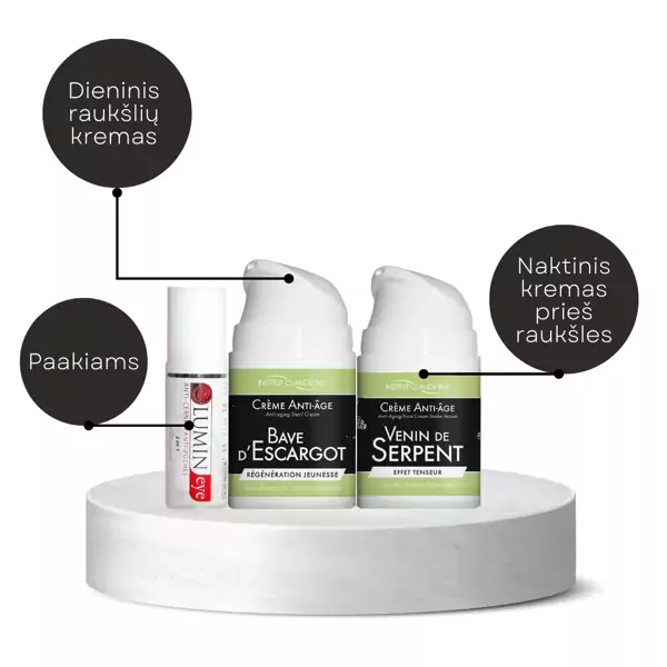 LUMIN EYE (20 ml): Patepkite akių zoną rytą ir vakarą švelniai patapšnojant nuo vidinės akies pusės į išorę. Po to iš karto galima naudoti makiažo priemones.
