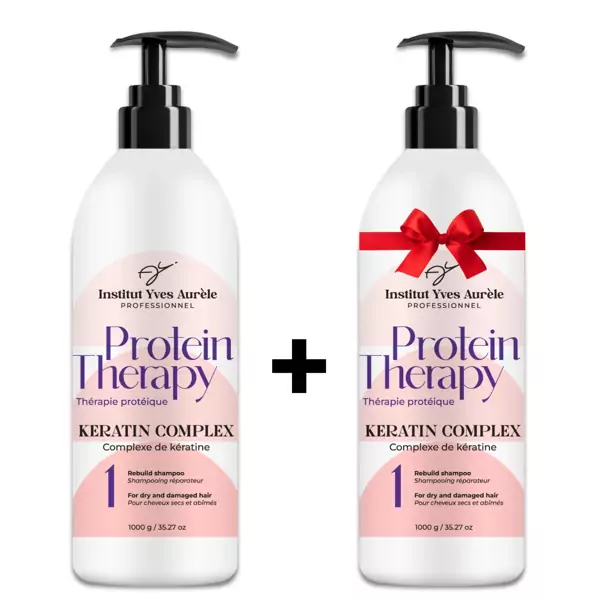 Protein therapy šampūnas (2x1000g): Aqua, Sodium Lauroyl Sarcosinate, Cocamidopropyl Betaine, Coco-Glucoside, Cocamidopropylamine Oxide, PEG-90 Glyceryl Isostearate, Cocamide MIPA, Methoxy PEG/PPG-7/3 Aminopropyl Dimethicone, Hydrolyzed Silk, Hydrolyzed Keratin, Aloe Barbadensis Leaf Juice, Panthenol, Polyquaternium-10, Hydroxypropyl Methylcellulose, Disodium EDTA, Parfum, Citric Acid, Laureth-2, Polysorbate 20, Phenoxyethanol, Ethylhexylglycerin, Methylchloroisothiazolinone, Methylisothiazolinone, Sodium Benzoate, Potassium Sorbate.