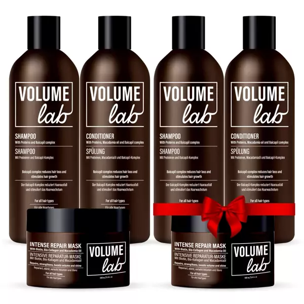 VOLUME LAB pilnas rinkinys praturtina plaukus būtinais elementais, veikia kaip išoriniai vitaminai plaukams.