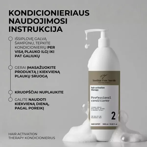 Kondicionierius (1000ml): Aqua (Water), Cetearyl Alcohol, Behentrimonium Chloride, Propanediol, Dimethicone, Cetyl Esters, Shea Butter Ethyl Esters, Rosmarinus Officinalis Leaf Extract, Mentha Piperita (Peppermint) Leaf Extract, Biotin, Inositol, Glycerin, Retinol, Aesculus Hippocastanum Seed Extract, Rosa Moschata Seed Oil, Zea Mays Oil, Phenoxyethanol, Parfum, Polymide-1, Caprylyl Glycol, Isopropyl Alcohol, Calcium Pantothenate, Tocopheryl Acetate, PEG-20 Castor Oil, Alcohol Denat., Citric Acid, Potassium Sorbate, Sodium Benzoate, Benzyl Salicylate.