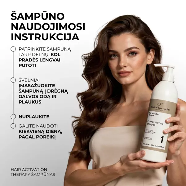 Šampūnas (1000ml): Tepkite ant drėgnų plaukų, leiskite suputoti ir nuplaukite.